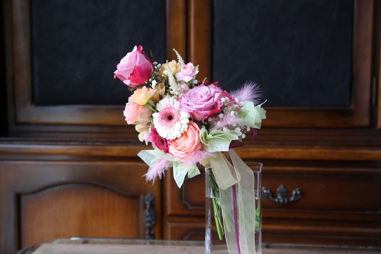 クロカンブッシュとはフランスのお菓子で、結婚式など何かのお祝いの席でシュークリームを高く積み上げ、皆さんで分けていただくスィーツです。もともとはゴツゴツとした木という事です。そんな形に似せて円錐形に形を整えます。隙間があかないようきっちりと並べると綺麗になります。アドバンスのチームは羽と柔らかい紙でベースの飾りとしました。様々異なる種類のお花を使いますので、どこから見ても楽しいブーケになります。こんなスタイルのウェディングブーケは如何でしょう。