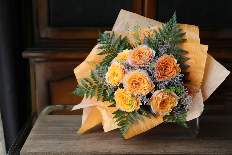 ハンドタイドブーケをマスターするため、短期集中レッスンを3月から始め、今回で最後のセッションです。初心に戻り7個の花で正確なポジションニングをしパッキングで完成です。安定したブーケはテーブルの上では自立し、見た目にもバランスが取れます。パッキングは装飾目的ではありますが、花を守るという重要な役目があります。今回組んだブーケでは一本花の高さが低く、どうしても花同士の間隔がくっついてしまった箇所がありましたが遠目で見れば美しいので合格とします。葉の処理、枝の切り方、ポジショニング、違ったスタイル、紐のかけ方など、毎回少しずつ学ぶ事も増えましたが、目的は達成されましたね。おめでとうございます!あとは経験となりますので、ご自分で練習をして下さい。