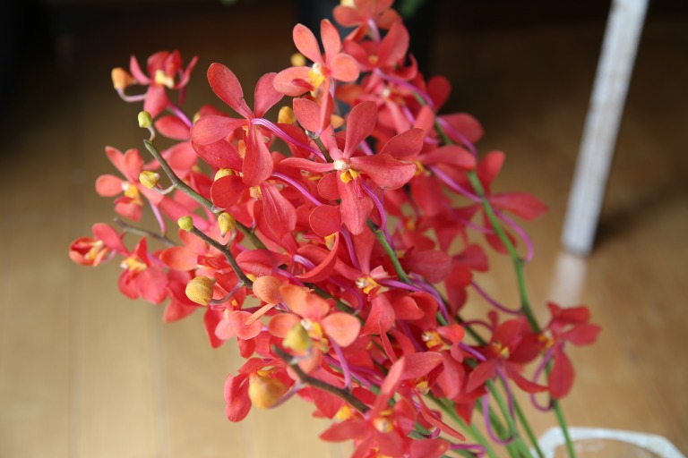 モカラは人工的に交配されてできた品種です。栽培は東南アジアの国々が盛んです。蘭は花が付きすぎていると水上がりが悪く、茎についているすべての花の元気がなくなる事が多いです。そんな時は思い切って下の花2-3個、あるいはダメージが大きい花を切り落とし、茎もナイフで切り戻しをし深水で様子を見て下さい。本来蘭の花はとても丈夫で水さえうまく上がれば2週間くらいは持つお花です。切り取った花もお皿に水をはり、花を浮かべ違ったスタイルで楽しめます。よいお花を上手に手入れして楽しんで下さい。