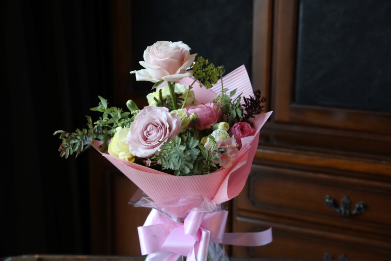 先月はクロカンブッシュのブーケでしたが、今回のレッスンはその形をスケールアップした花束です。ハンドタイドでスパイラルに組みますが真ん中が高く飛び出て、その周りにワサワサと花が入り、横からみると丁度コーンのように見せたかったのですが....。一本中心部にあったバラが折れてしまったのと、私が持ってきたラッピングが固く、せっかく作った形が包装紙で隠れてしまいました。スミマセン。ご自宅でラッピングを外しもう一度組み替えるてみるのもよいと思います。今の時期は花がとても長く持ってくれますので何度か練習してみましょう!