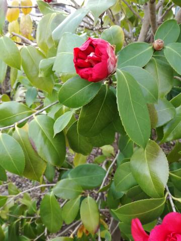 最初はボタンの花かと思いましたが、まだその季節でない事に気づき、葉を観察するとまぎれもなく椿。椿にもこんな咲き方をする花があるんですね。このユニークな咲き方は唐子咲というそうで、大唐子(オオカラコ)もしくは紅唐子だと思いますが、どちらかはわかりません。椿はどこのお庭でも見られるためあまり気に留めていなかったのですが、花も千差万別で美しいです。紅色系 唐子咲きの椿を集めたページ見つけましたのでリンクします。http://www.nagominoniwa.net/camellia/karako-r.html