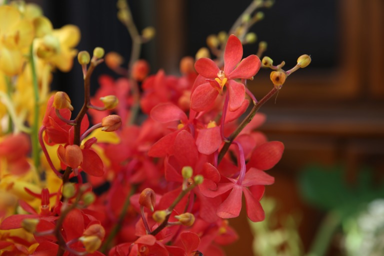 'ルビー' と名付けられていますが、実際はオレンジ混じりの赤です。モカラはシンガポールにて、ラン科のアスコセントラム属、バンダ属とアラクニス属を掛け合わせて作られた育成種です。それぞれのよい所を取って生まれた品種ですので、色もよく日持ちもします。本来暖かなエリアの花の為冬の寒さはとても苦手です。暖かさを好むラン類、アンスリュームなどは適温で管理してください。水あげがスムーズですと一週間は花の色も褪せず楽しむことができます。この花は状態のよい物とそうでない物のギャップが大きいので確認が必要です。海外からの輸入は必ずしも上等なものばかりではありません。モカラを購入する時は花がくたびれて下向きになっていないかよくチェックしてください。上手く水が上がっていればハリがあり写真のように綺麗です。