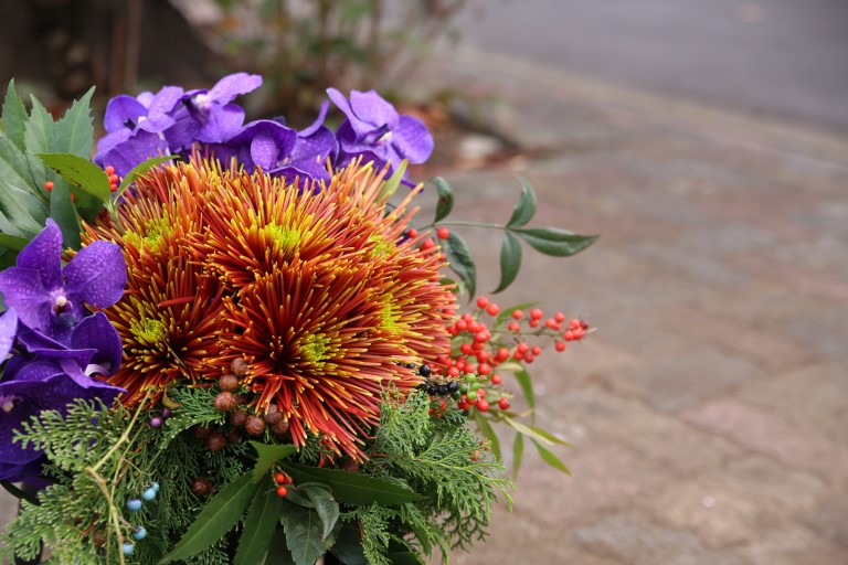和風のブーケのリクエストを頂きました。色はこっくりと深い秋色に気高い青紫を加えてみました。着物の世界は少しだけ季節を先取り、晩秋から春までの植物のリレーを盛り込んでみました。 お申込み お届けの花束やアレンジメントはご予算にて承ります。 用途 お祝い 誕生日